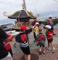 新しい神輿をかついで、島を練り歩きました。ワッショイ!